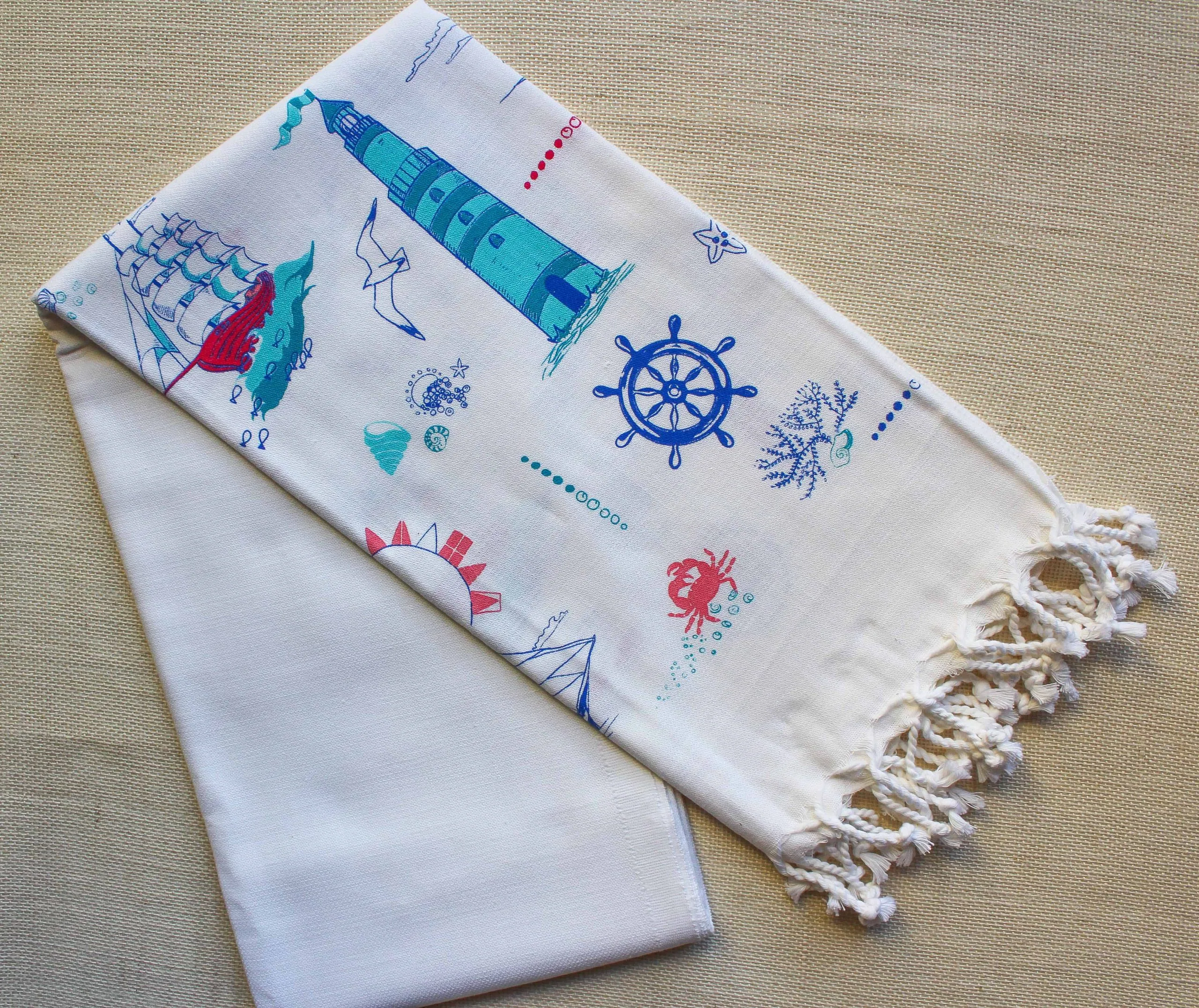 A towel is important to be absorbent. This type of towel which is Peshtemal is ultra-soft and extremely absorbent, and it is made of 100% natural Turkish cotton that’s hand-woven on ancient looms. Its elegant lighthouses figures makes it as stylish as it is versatile. Your favorite towel/peshtemal is available in a full variety of colors