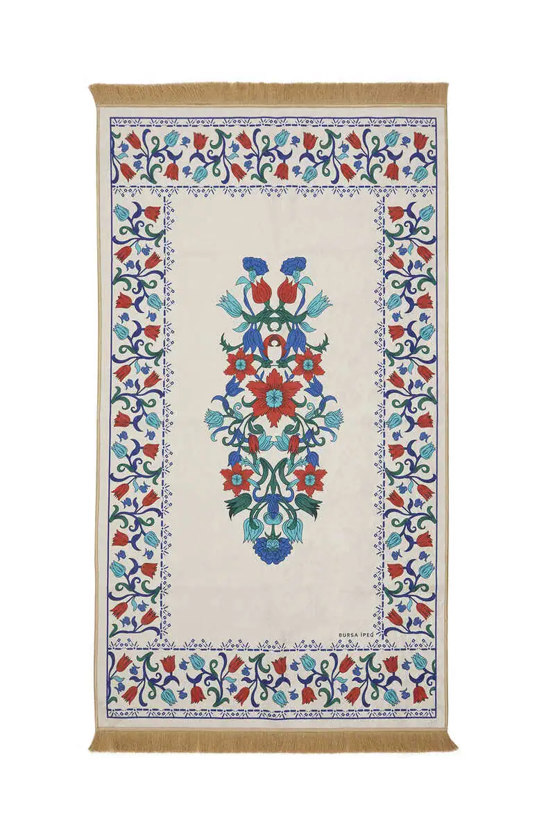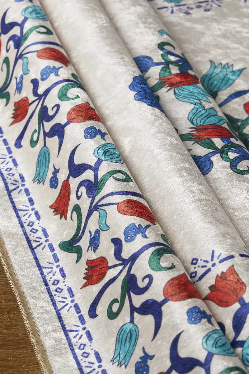 The Beyaz Kadife Halı Seccade is a 65x115cm prayer rug featuring Turkish motifs and tile patterns. It is designed in Bursa, Turkey, with a silky velvet texture for decorative appeal and ease of use.