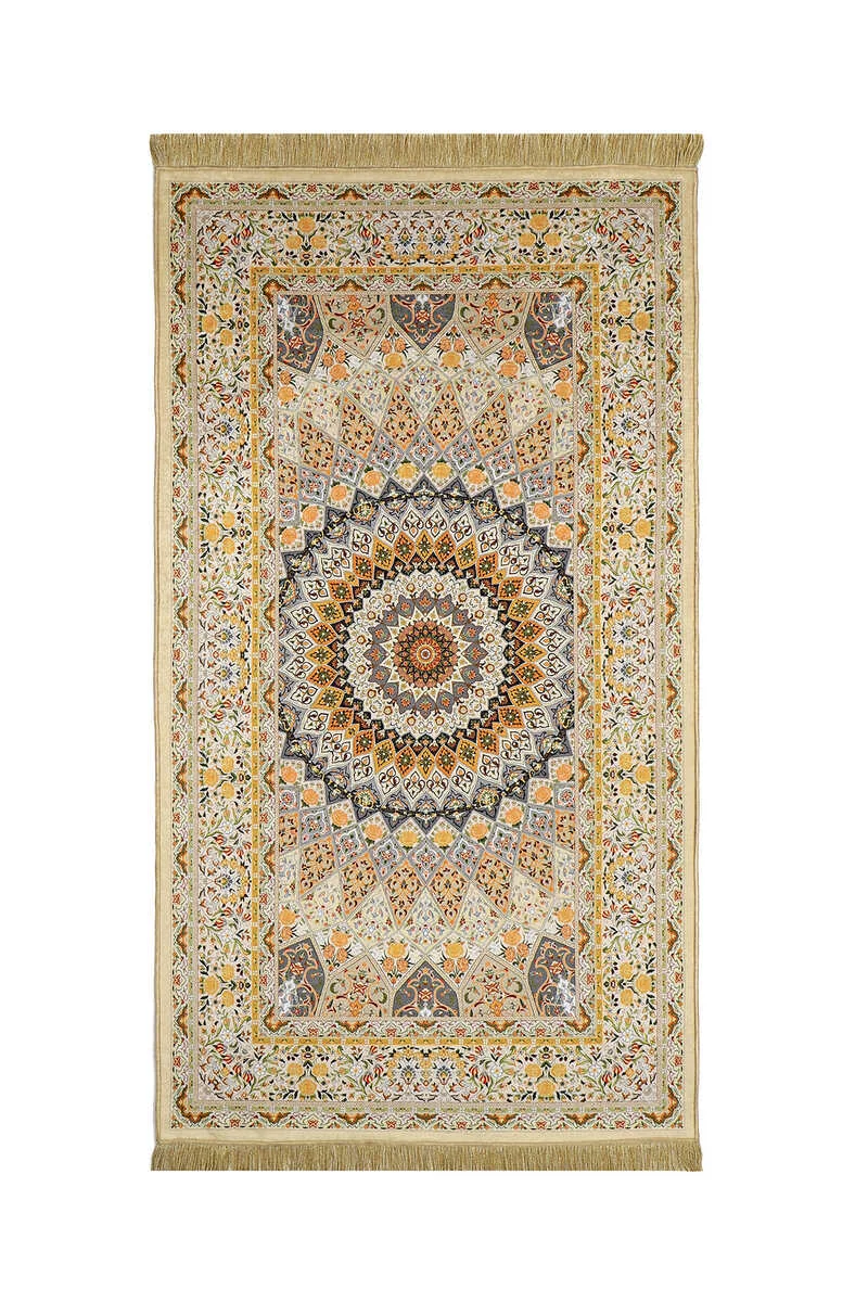 The Sarı Kadife Halı Seccade is a prayer rug featuring Turkish motifs and tile patterns, designed for decorative appeal. It measures 65×115 cm and is made with a velvet texture in Bursa, Turkey.