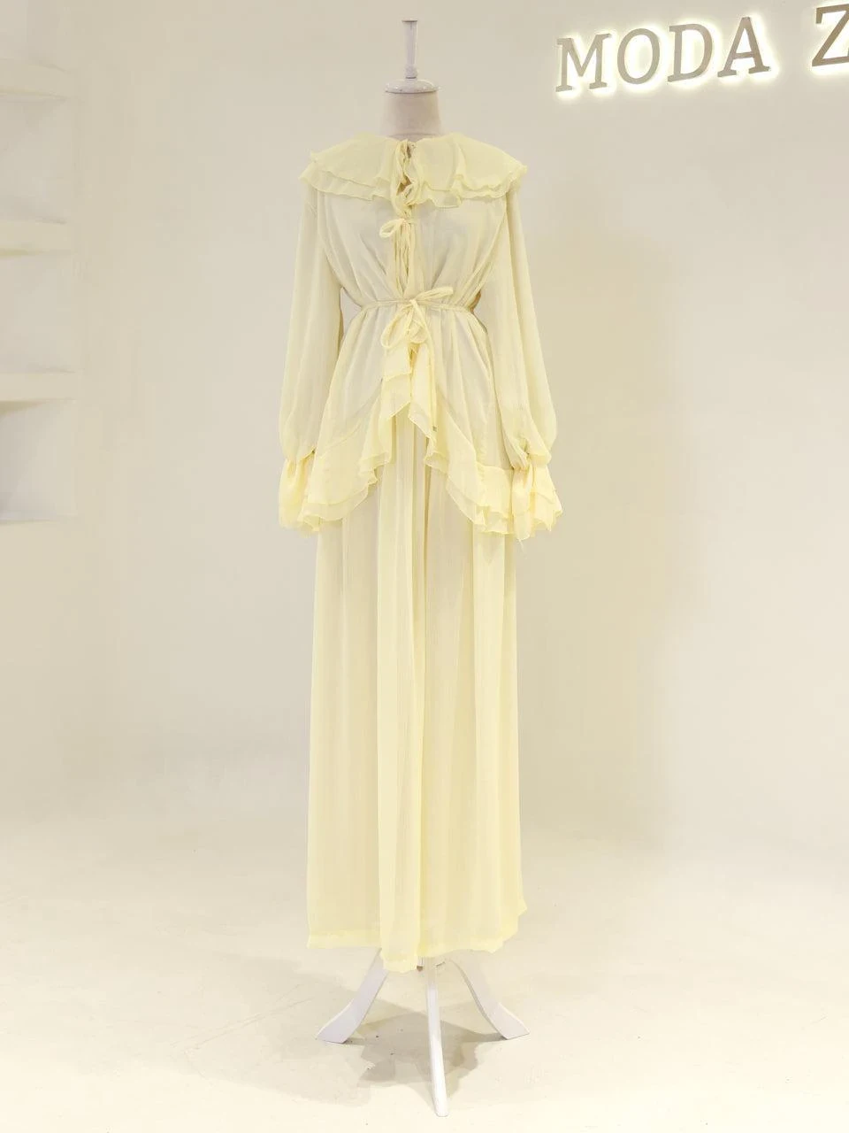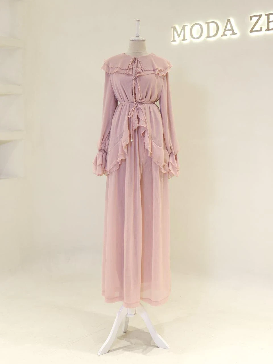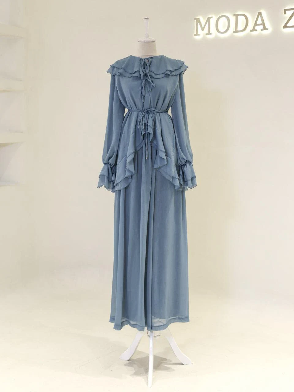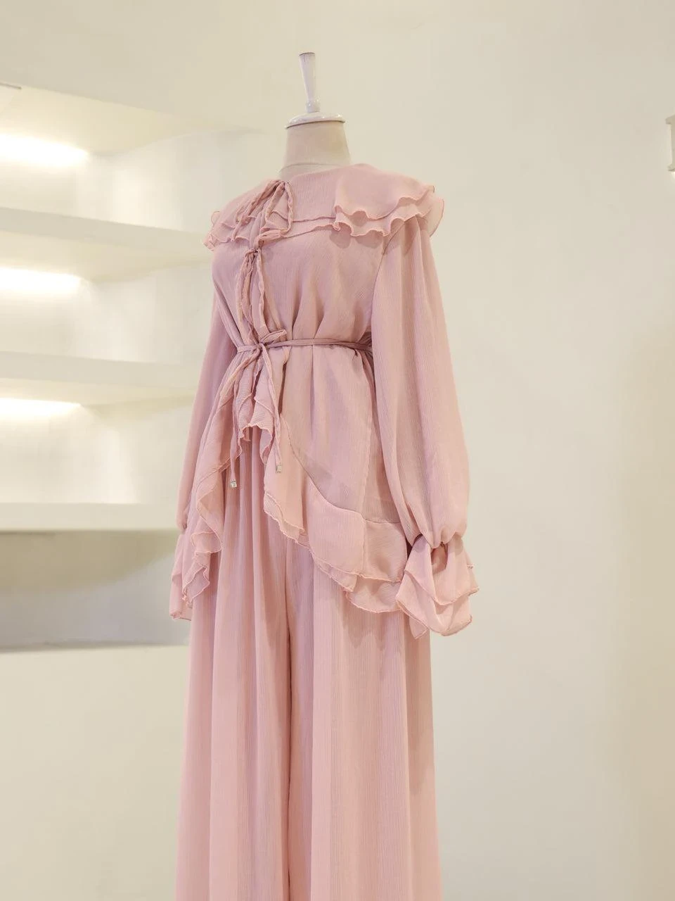 The Yilda Modest Outfit Set is designed with a focus on elegance and comfort. The top has a front length of approximately 60 cm and a back length of 75 cm, while the pants are 115 cm long. Made from chiffon fabric, the set includes a lining for added comfort. It features a detachable belt and a bow tie detail at the neckline. The front is adorned with ruffle decorations, and the cuffs are elasticated for a snug fit.