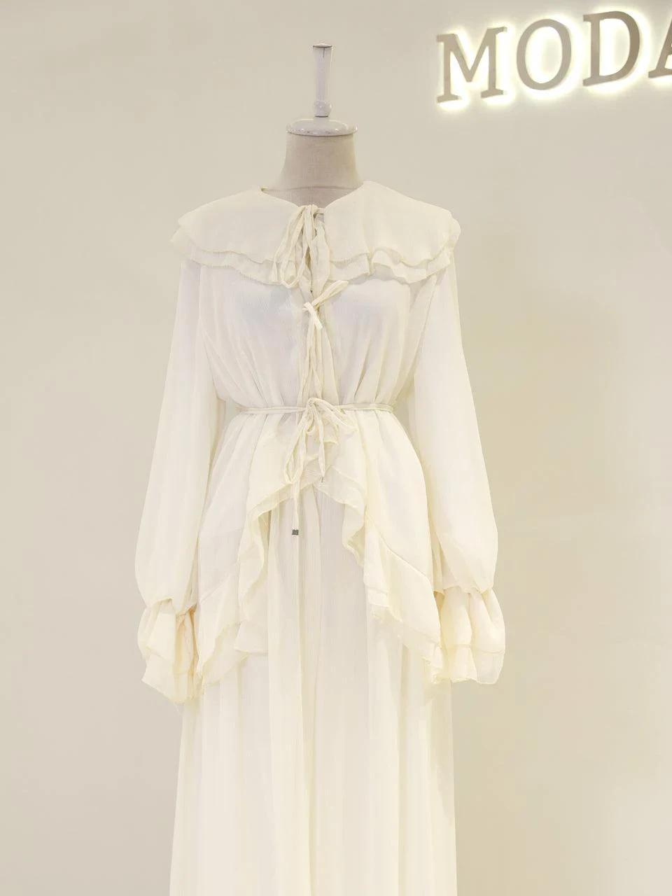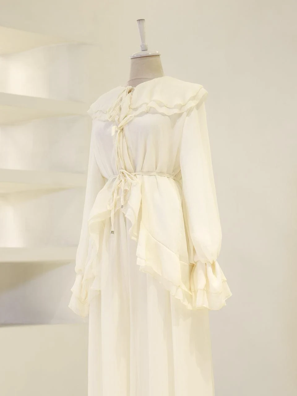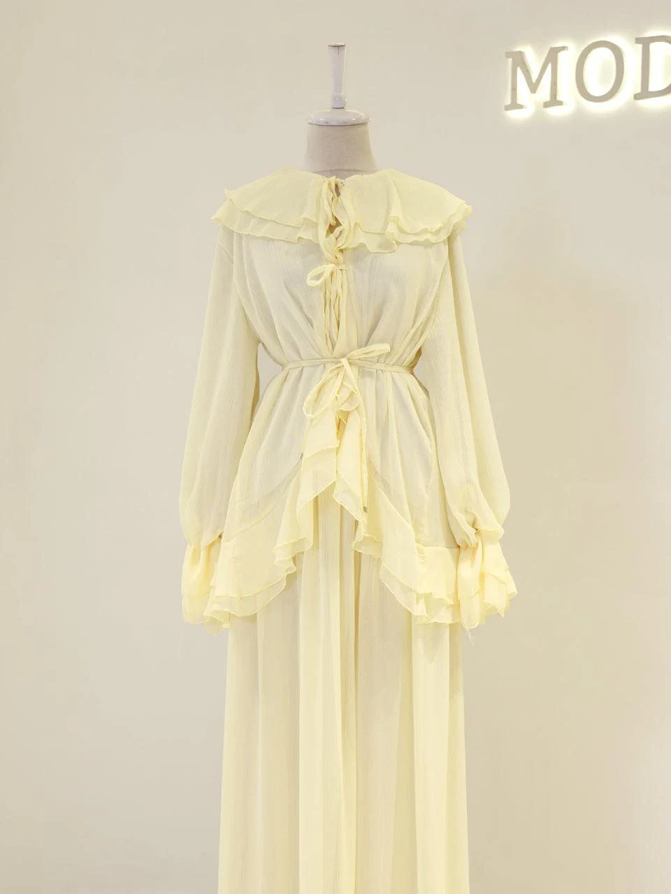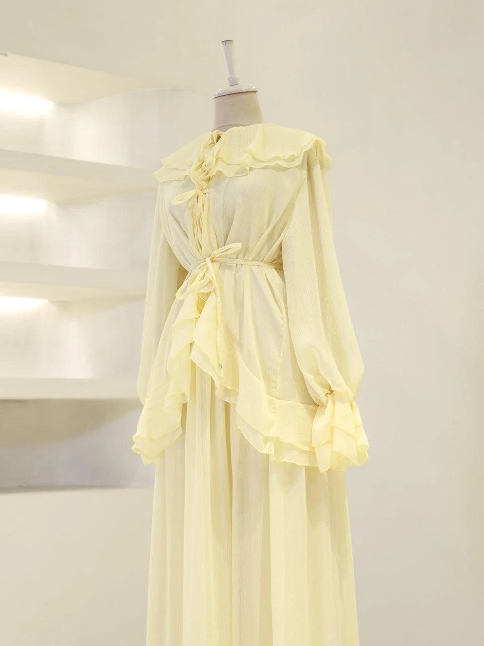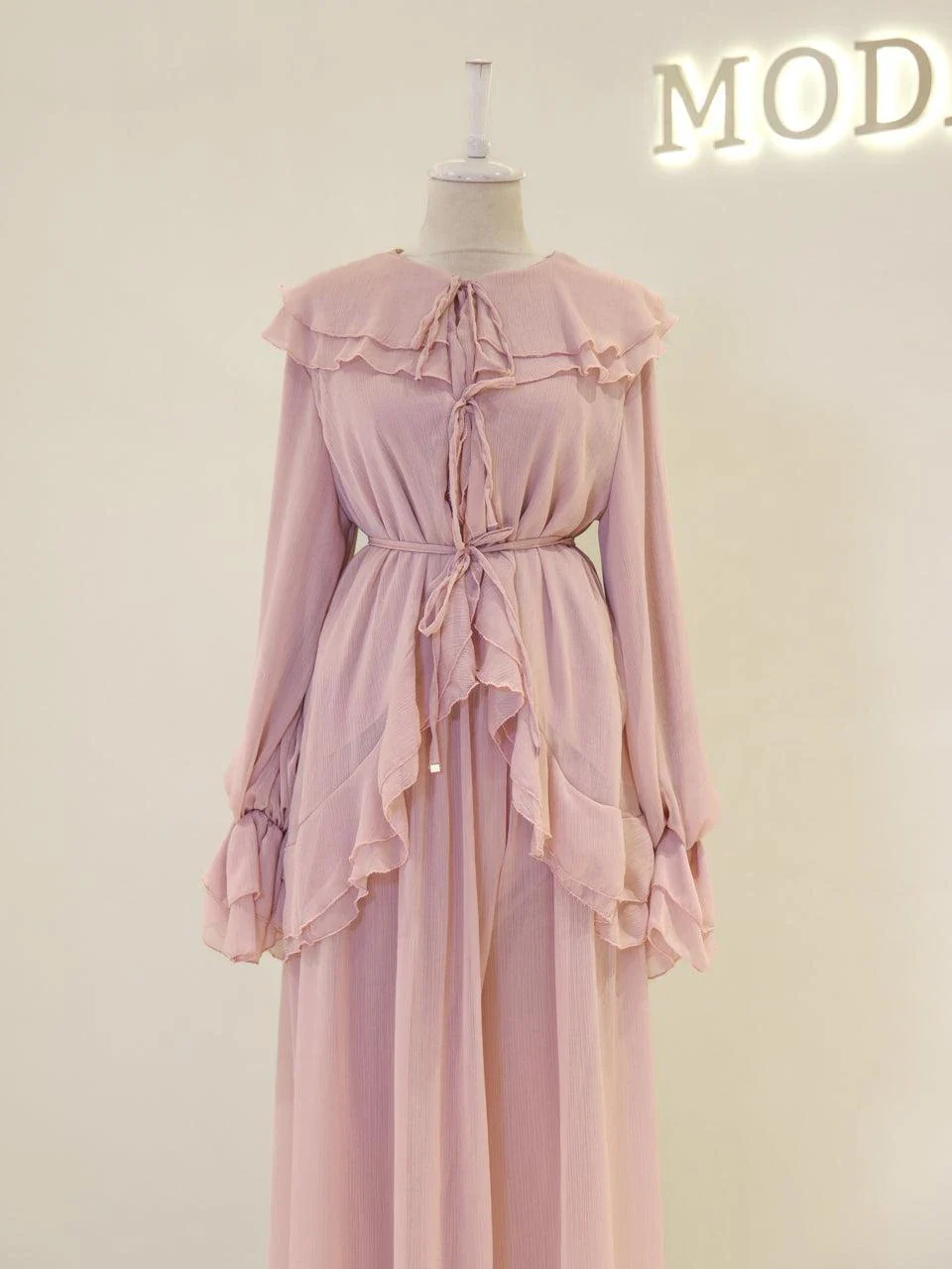 The Yilda Modest Outfit Set is designed with a focus on elegance and comfort. The top has a front length of approximately 60 cm and a back length of 75 cm, while the pants are 115 cm long. Made from chiffon fabric, the set includes a lining for added comfort. It features a detachable belt and a bow tie detail at the neckline. The front is adorned with ruffle decorations, and the cuffs are elasticated for a snug fit.