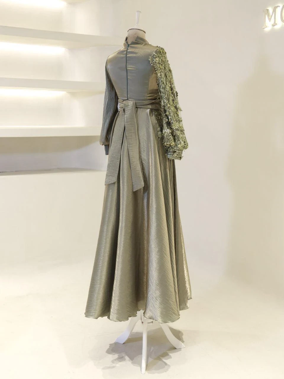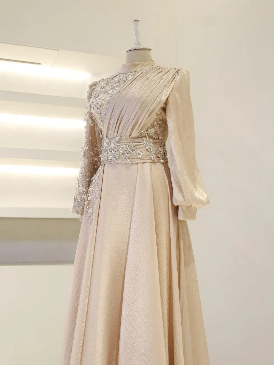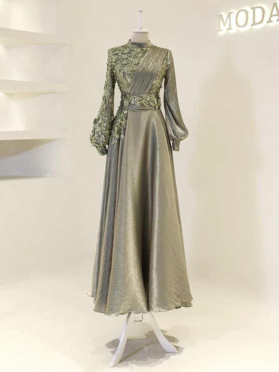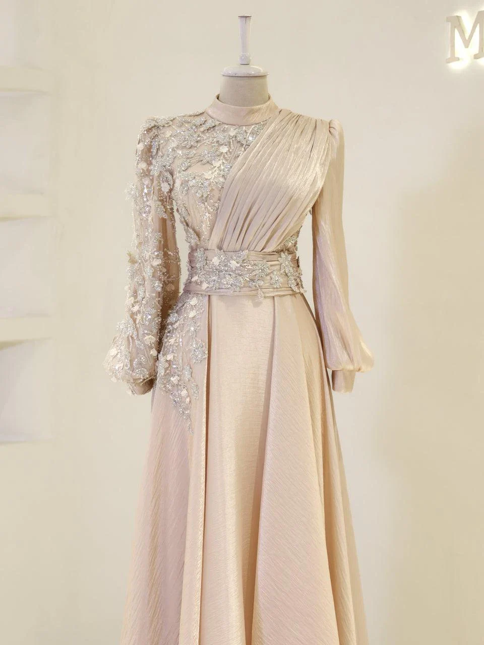 The Zarunya Modest Evening Dress is crafted from orchid fabric, offering a sophisticated look for special events. It has a standard fit with an average length of 165 cm. The dress is designed with a back zipper for easy wear and includes a chest pad for added comfort. The balloon sleeves add a touch of elegance, while the non-adhesive embellishments ensure durability. A belt detail enhances the waistline, and the dress features a flared skirt for a graceful silhouette.