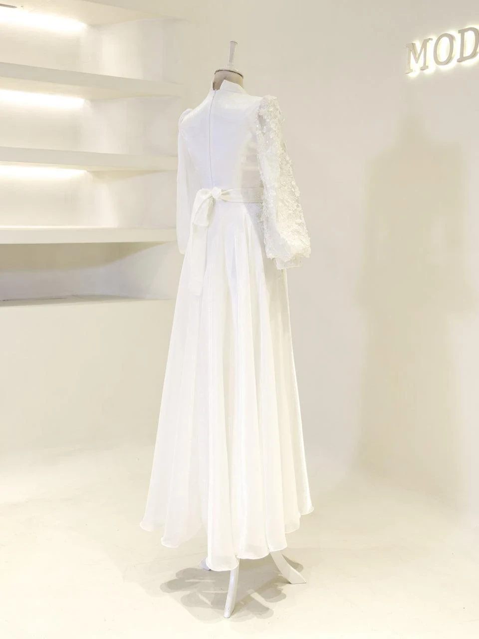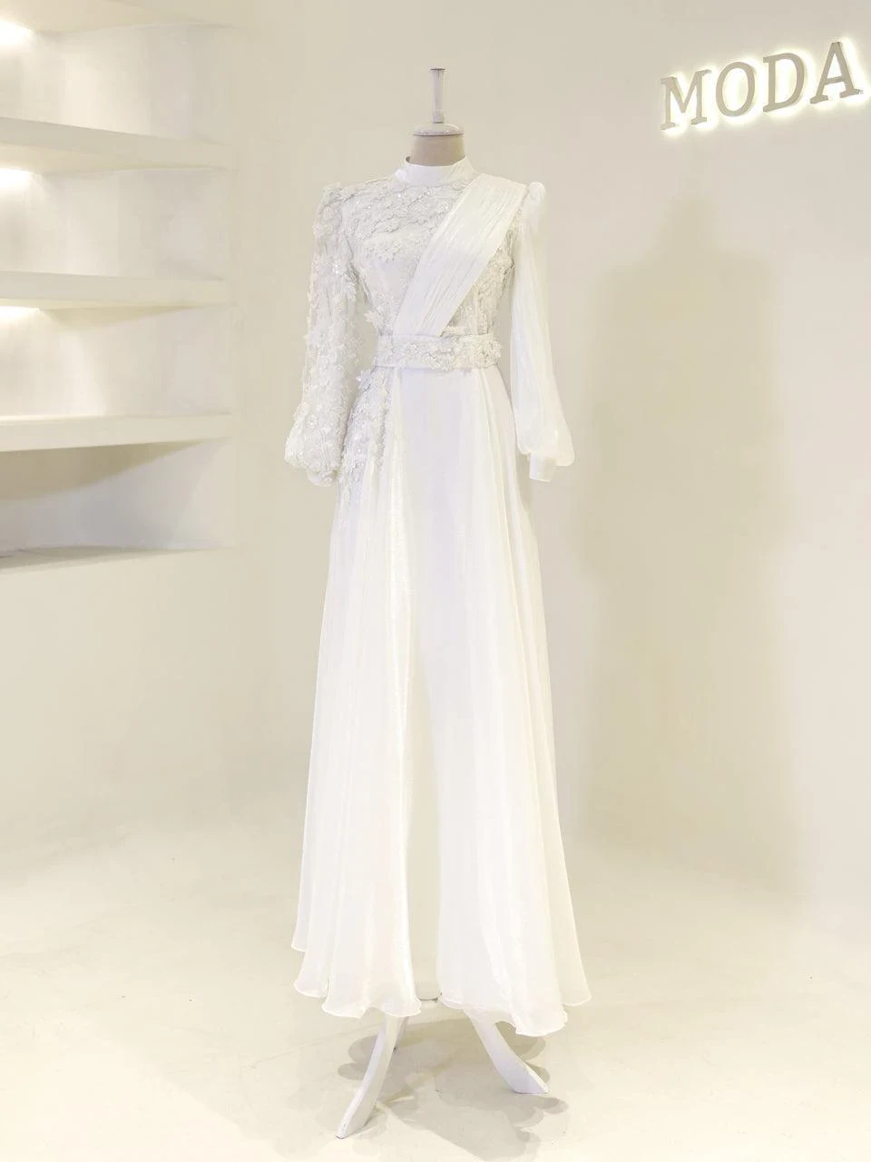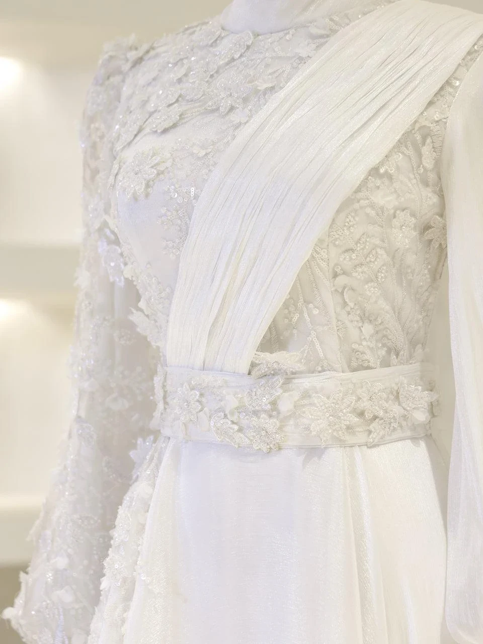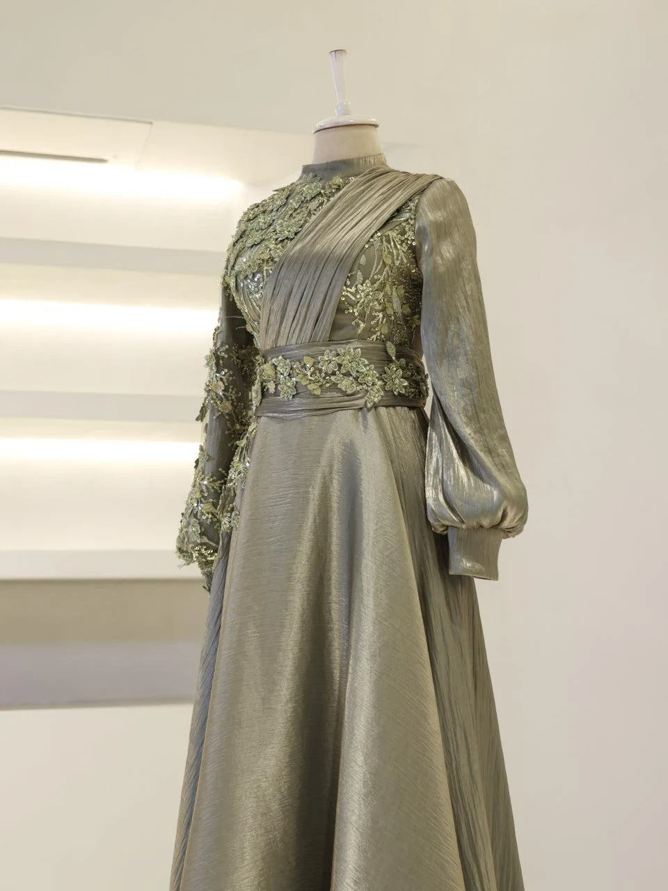 The Zarunya Modest Evening Dress is crafted from orchid fabric, offering a sophisticated look for special events. It has a standard fit with an average length of 165 cm. The dress is designed with a back zipper for easy wear and includes a chest pad for added comfort. The balloon sleeves add a touch of elegance, while the non-adhesive embellishments ensure durability. A belt detail enhances the waistline, and the dress features a flared skirt for a graceful silhouette.